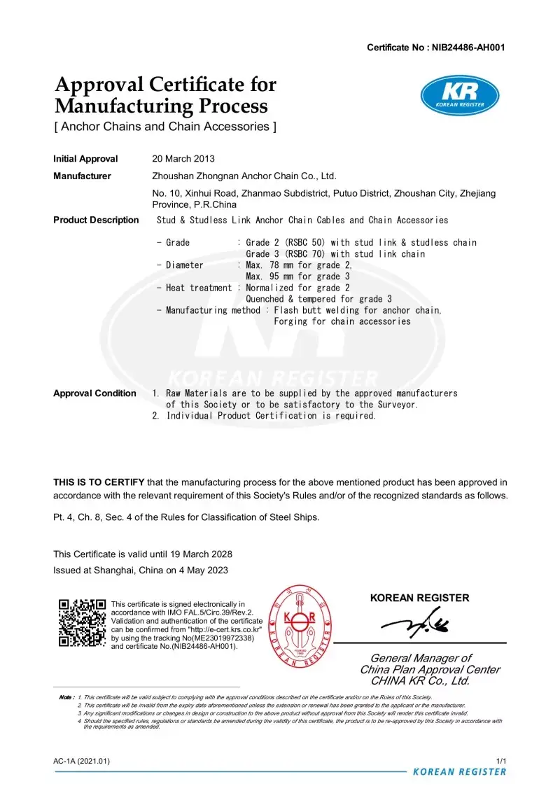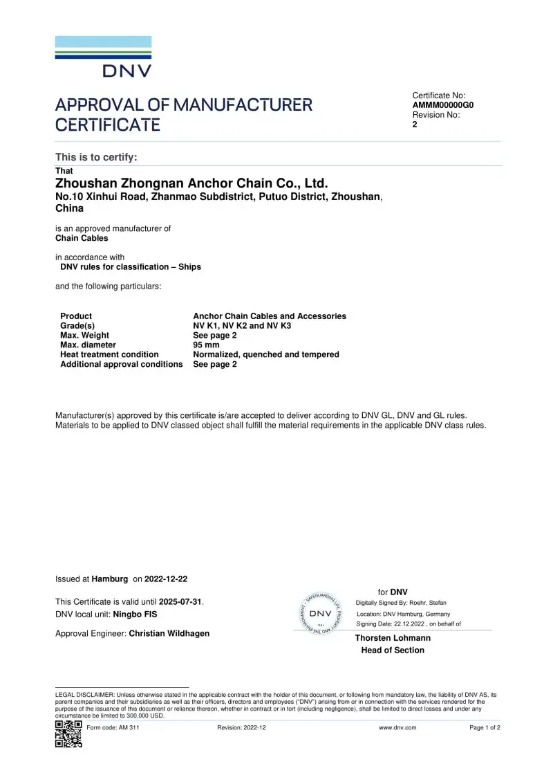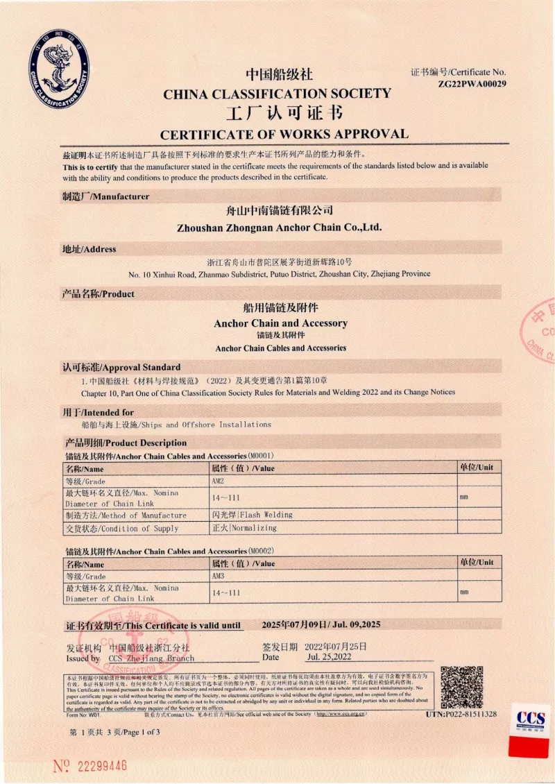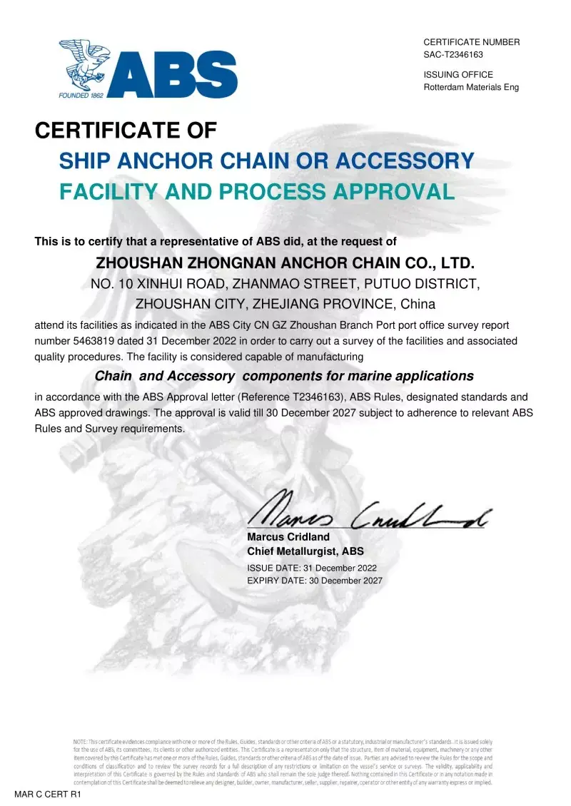 होय, निश्चितपणे. सर्व अँकरझोशान झोंगनन अँकर चेन को., लिमिटेडऑफर एबीएस, डीएनव्ही, एलआर, बीव्ही, एनके, केआर, सीसीएस, रीना, आरएस आणि आयएसओ, आयएसीएस मानकांद्वारे मंजूर आहेत. ही प्रमाणपत्रे हे सुनिश्चित करतात की आमचे अँकर ग्लोबल शिपिंग आणि ऑफशोर उद्योगांनी ठरविलेल्या सुरक्षा, टिकाऊपणा आणि स्ट्रक्चरल सामर्थ्य आवश्यकता पूर्ण करतात.