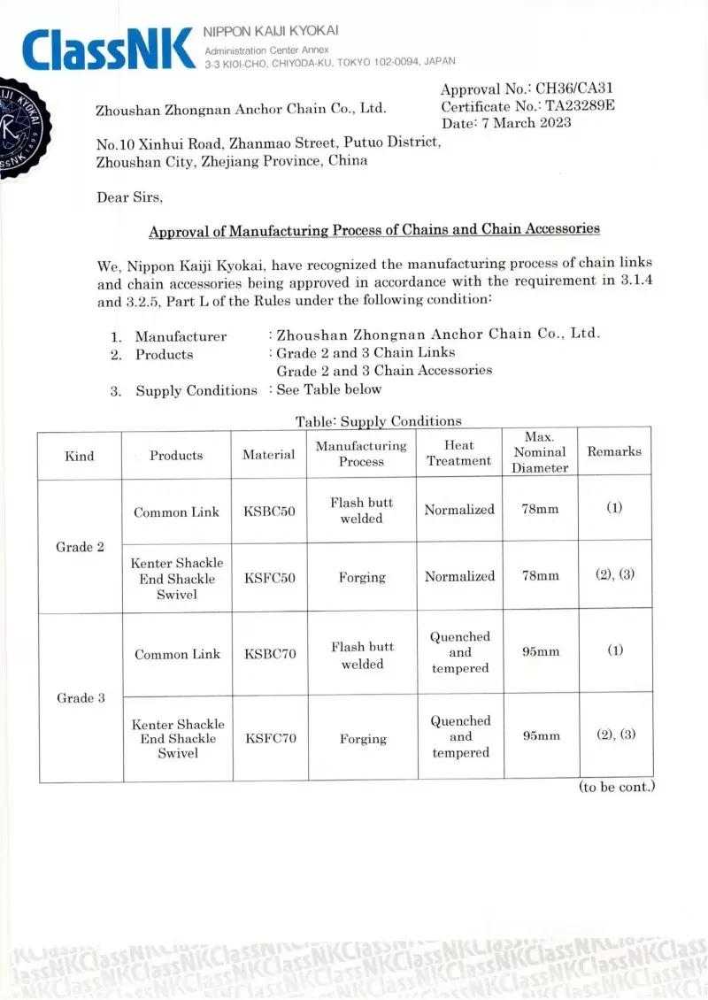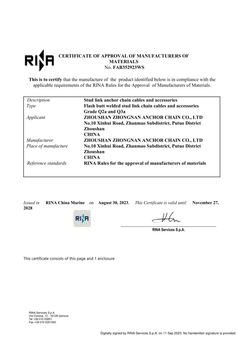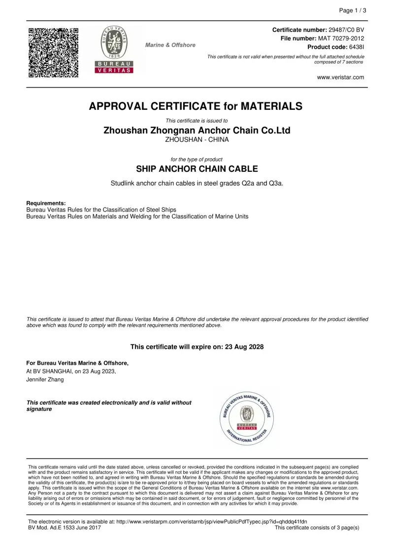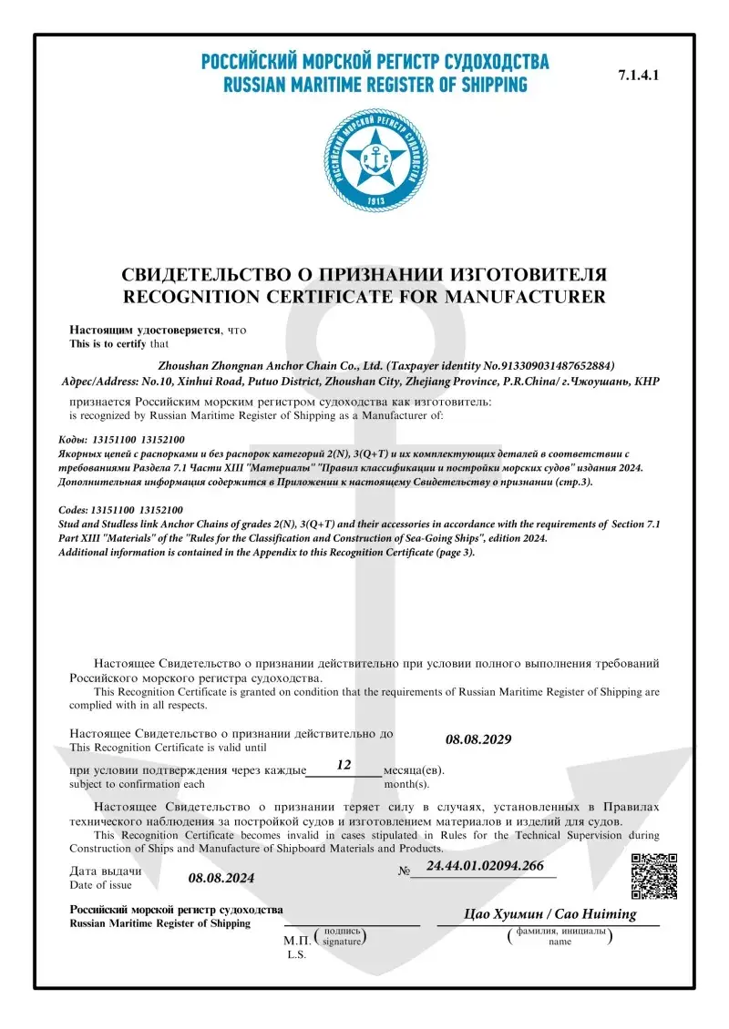 होय, निश्चितपणे. सर्व अँकरझोशान झोंगनन अँकर चेन को., लिमिटेडऑफर एबीएस, डीएनव्ही, एलआर, बीव्ही, एनके, केआर, सीसीएस, रीना, आरएस आणि आयएसओ, आयएसीएस मानकांद्वारे मंजूर आहेत. ही प्रमाणपत्रे हे सुनिश्चित करतात की आमचे अँकर ग्लोबल शिपिंग आणि ऑफशोर उद्योगांनी ठरविलेल्या सुरक्षा, टिकाऊपणा आणि स्ट्रक्चरल सामर्थ्य आवश्यकता पूर्ण करतात.